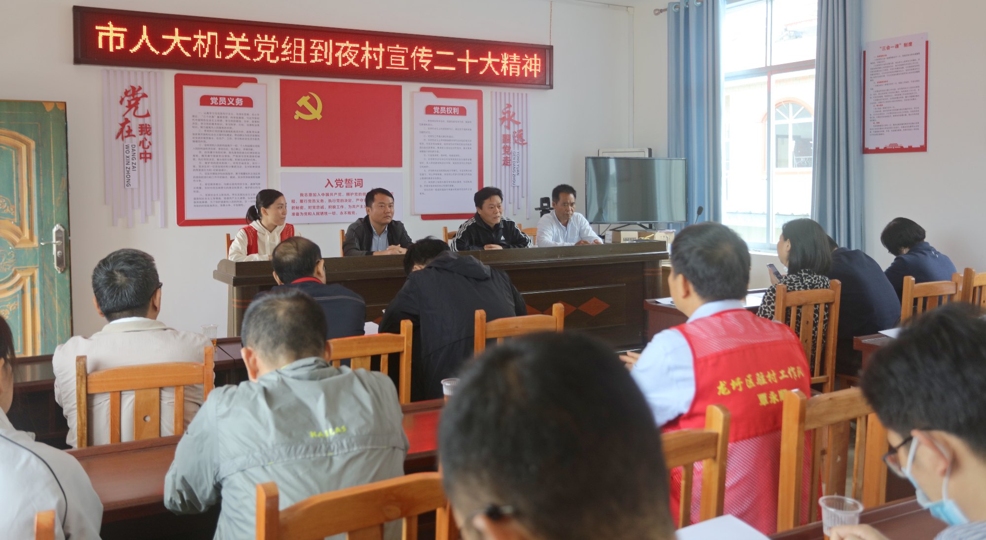 在夜村村委会会议室,阳永煊向夜村党员、群众宣讲党的二十大精神。宣讲会要求,我们要坚定不移地学习贯彻党的二十大精神,领会落实全过程人民民主、法治体系建设等要求,特别关注全面乡村振兴的要求,把握农业要高质高效、农村要宜居宜业、农民要富裕富足三大核心,切实推进乡村建设;要坚持不懈地推动巩固脱贫攻坚成果同乡村振兴有效衔接,付出更实更有效的努力,不断提升农村的基础设施建设、生态环境建设及产业建设,以问题为导向找条件破瓶颈,切实推动工作见成效;要千方百计地把“五个一”主题活动做实做出成效,引导群众积极参与乡村振兴、乡村治理、精神文明建设等工作,走访要入脑入心,听民声聚民智解民忧,及时记录好建议、好办法,把人大工作做到基层,把工作抓细抓实,持之以恒把乡村建设好。