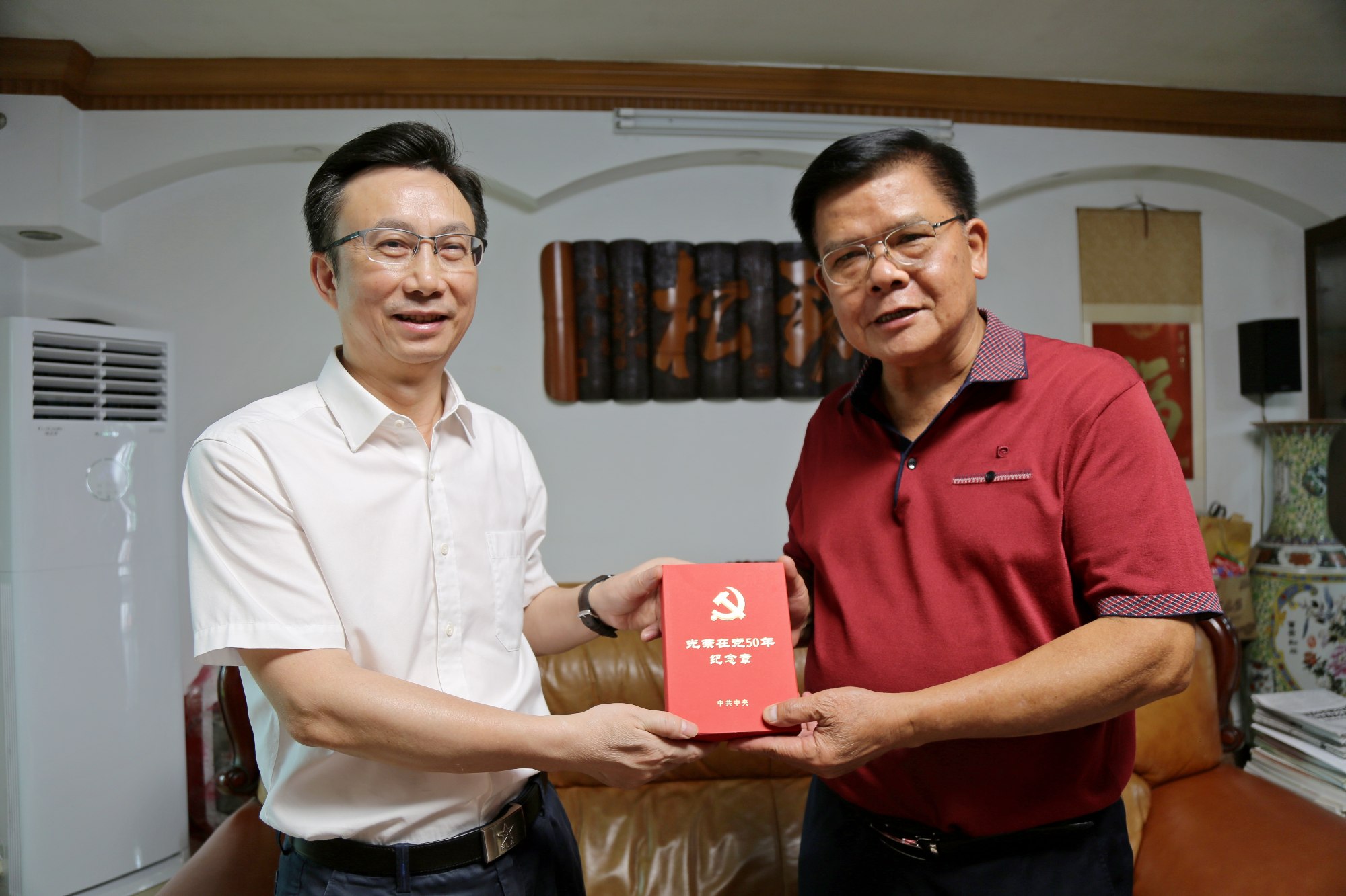 黄中贤为老党员竺坤松颁发“光荣在党50年”纪念章