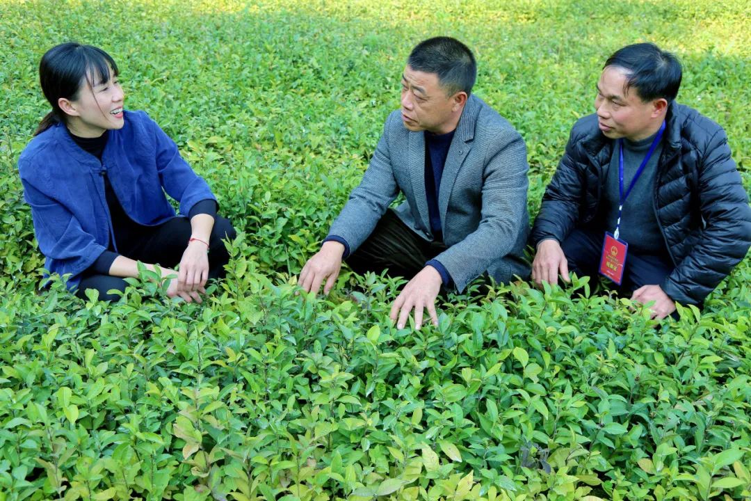 中国共产党员、十四届全国人大代表石濡菲(左一)深入苍梧县六堡镇茶园,收集党员、茶农的意见建议 颜桂海/摄