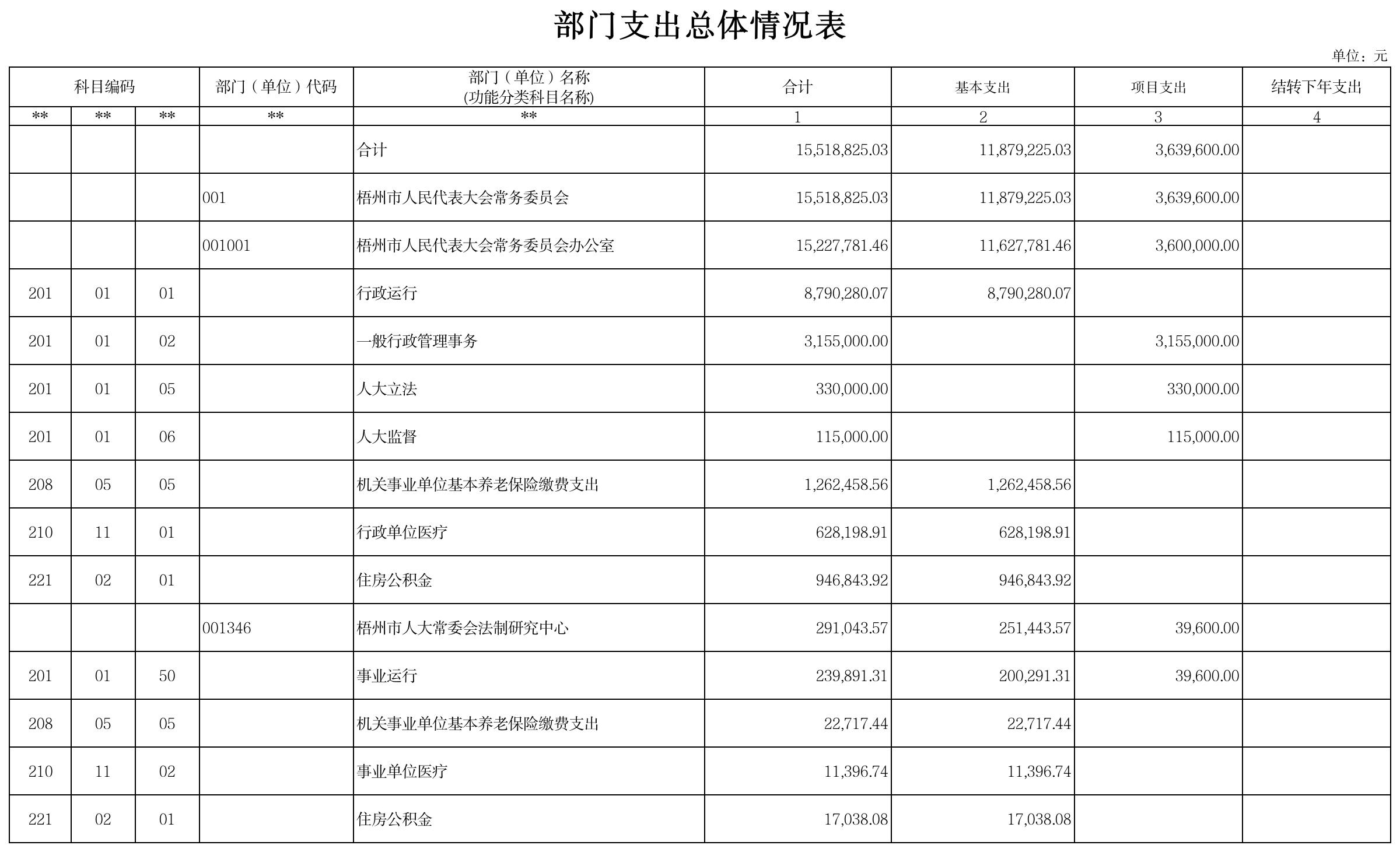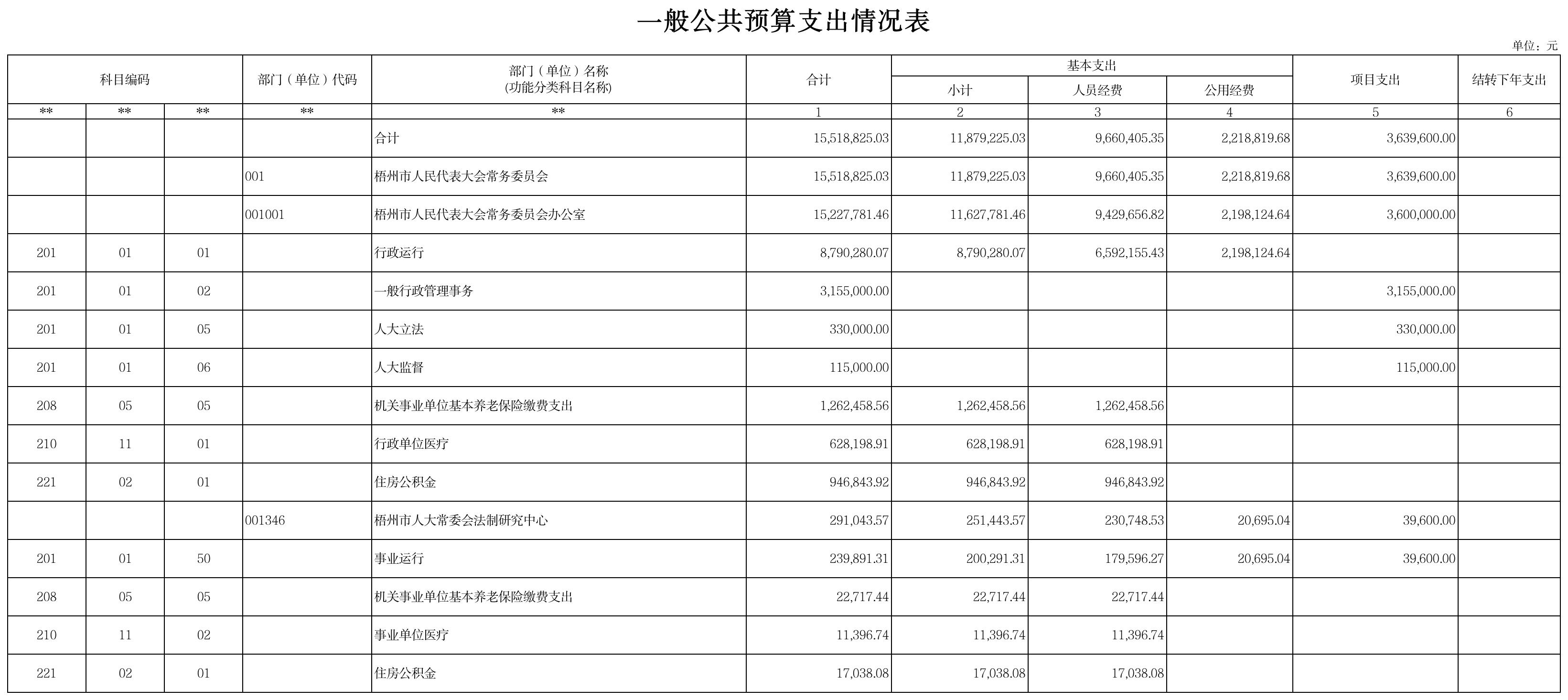 2022年部门预算(含所属二层预算单位)共有项目(含基本支出)29个,项目涉及金额15518825.03 元,其中:在职在编人员经费项目6660669.08元 ; 定额公用经费(含党建、团建、公共机构节能经费、节水城市工作经费和垃圾分类工作经费)项目1084703.58元;定额商品和服务支出中工会经费项目103296.42元;公用经费(改革性补贴)公务交通补贴项目737400元、机关事业单位伙食补助项目216000元; 编外人员支出(机关后勤和劳务派遣)项目270395.26元;专项公用经费全国全区全市人大代表学习、观察、调研工作经费项目730000元;专项公用经费市人大常委会依法履职、开展监督工作、对外交流活动工作项目800000元;专项公用经费立法经费项目330000元;专项公用经费人大及常委会讨论研究和人大新闻宣传工作经费项目875000元;专项公用经费学习培训专项经费项目150000元;专项公用经费人大预算联网监督系统运行费项目115000元;梧州人大会议室改造600000元