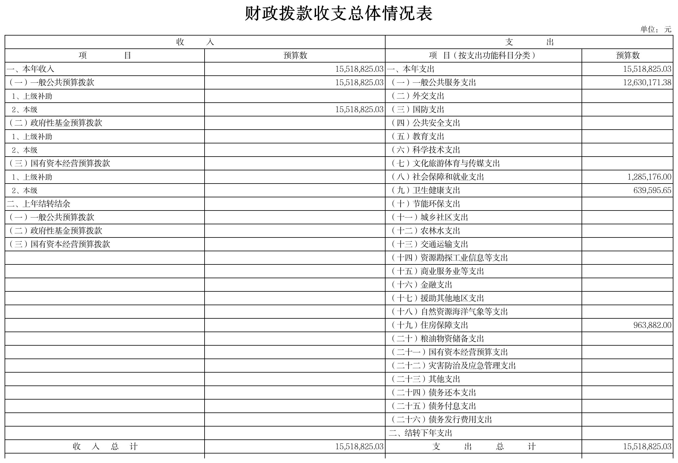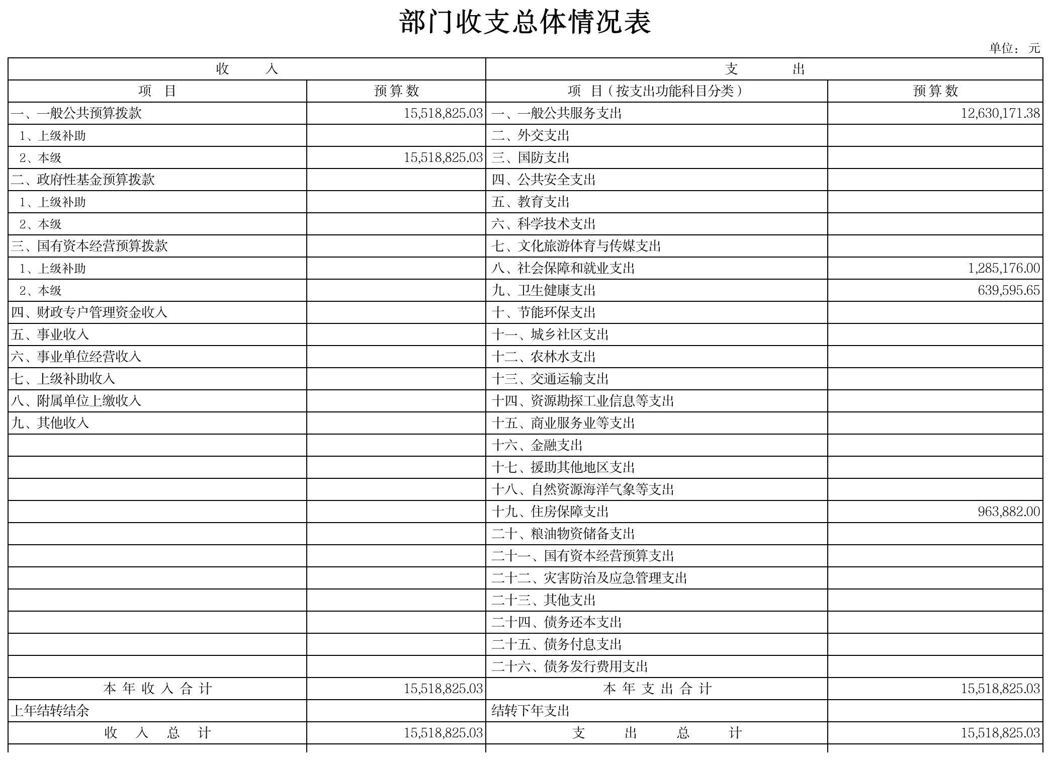 2022年财政拨款收支总预算 15518825.03元。收入包括:一般公共预算拨款15518825.03元、支出包括:一般公共服务支出12630171.38元、社会保障和就业支出1285176 元、卫生健康支出639595.65元、住房保障支出963882元