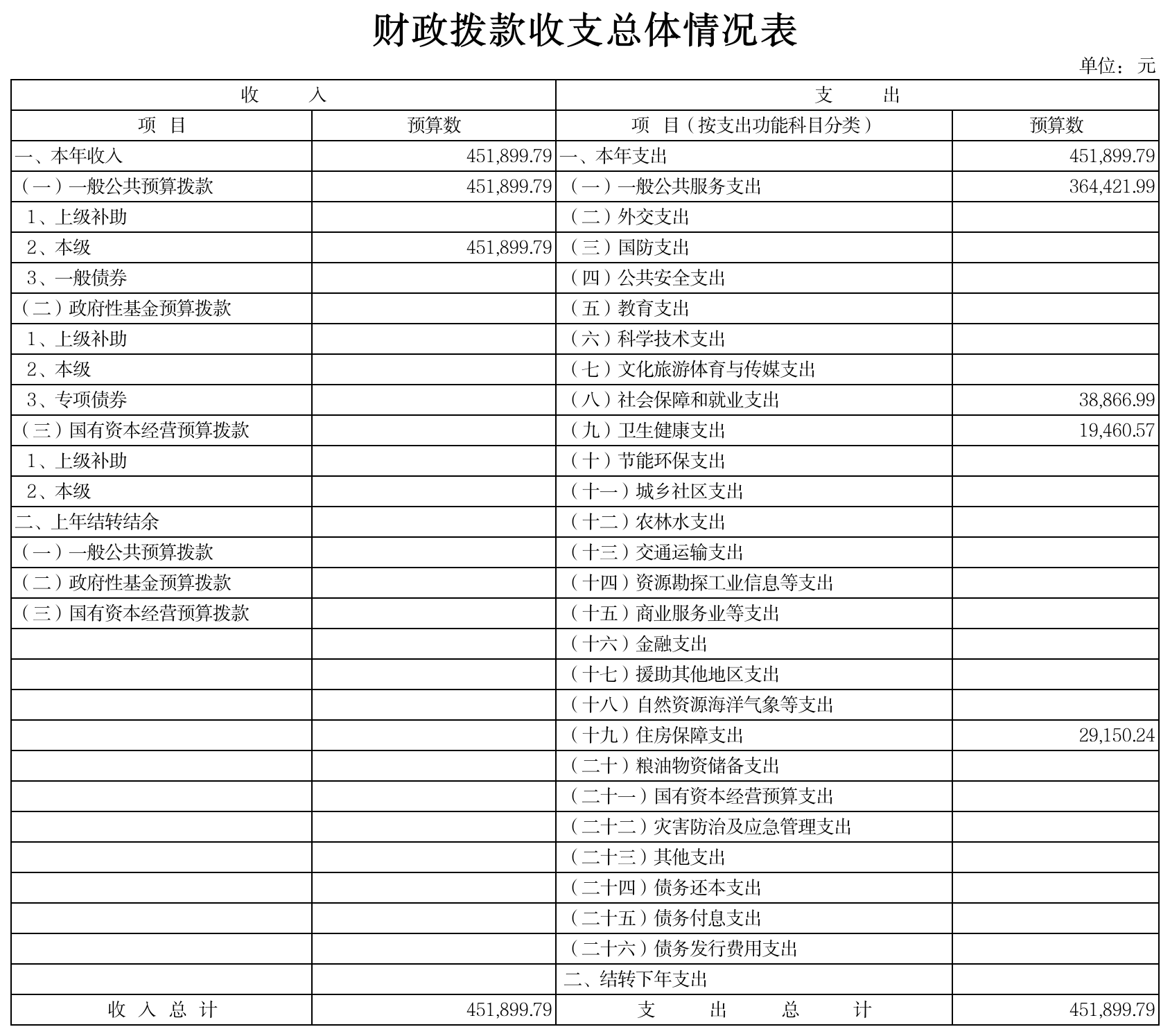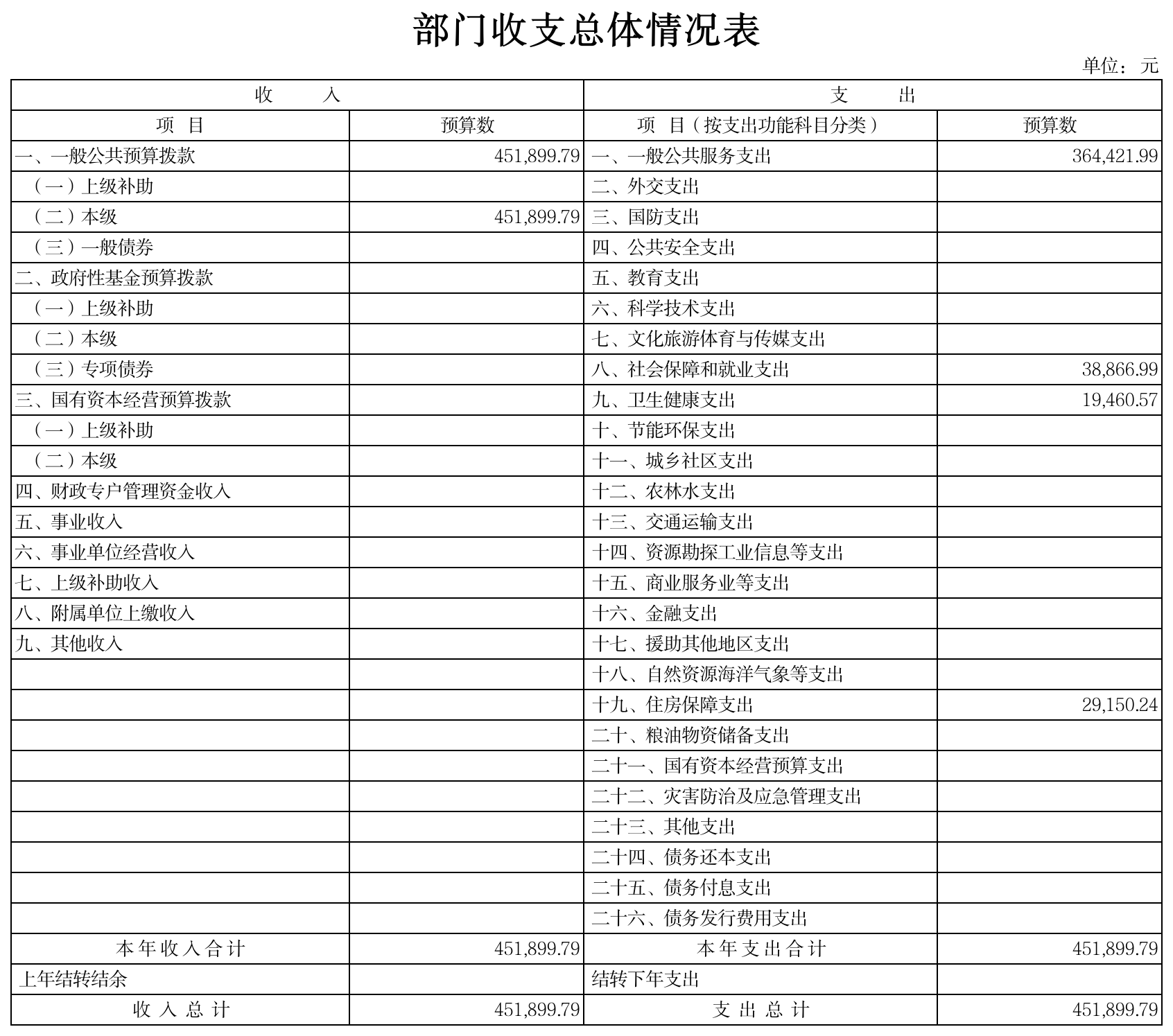 2023年收支总预算451899.79元,同比增加160856.22元,增长55.27%。收入包括:一般公共预算拨款;支出包括:一般公共服务支出、社会保障和就业支出、卫生健康支出、住房保障支出。
