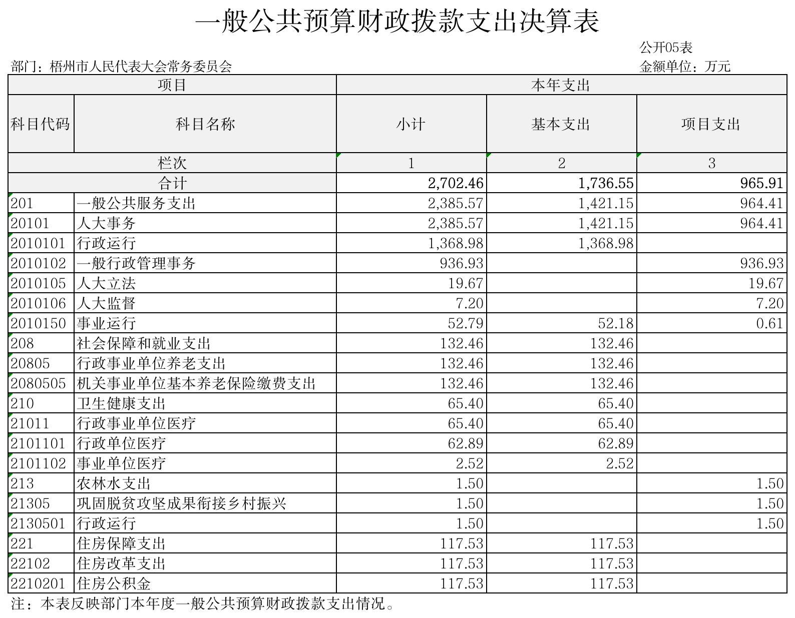 梧州市人民代表大会常务委员会2024年度一般公共预算财政拨款支出2702.46万元,较2023年度决算数增加153.99万元,增长6.04%。其中:基本支出1736.55万元,项目支出965.91万元。