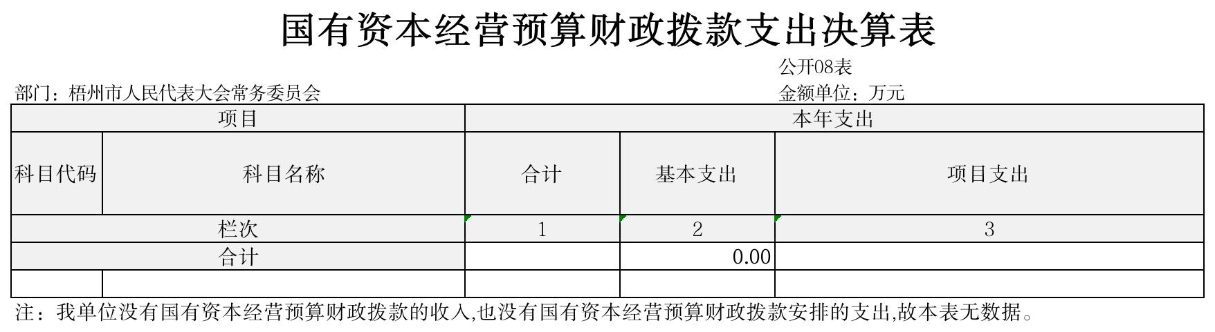 梧州市人民代表大会常务委员会2024年度国有资本经营预算支出0.00万元。其中:基本支出0.00万元,项目支出0.00万元。