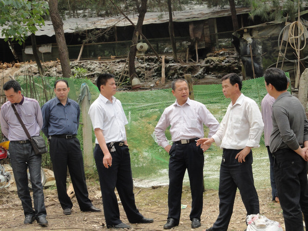 图为该市人大常委会副主任胡六才(左四)带领调研组深入三黄鸡山地养殖场检查禽流感防控工作落实情况。