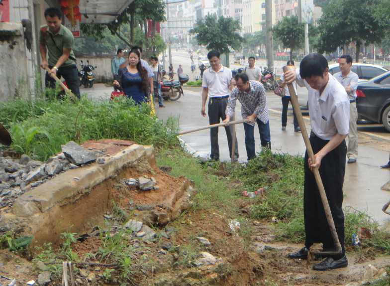 藤县人大机关自全县启动“美丽藤县·清洁乡村”活动后,组织24名党员成立“清洁服务队”,对责任保洁区进行“每周一大洁、每天一小洁”活动,重点清除杂草、清通水沟、清扫垃圾,达到角落清洁、路面干净、街道漂亮的效果。至目前,该县人大机关清洁服务队共出动130多人次,清理垃圾6车,保洁街道路面约13000平方米。图为党员清洁服务队利用下班时间清理责任区一处杂草。
