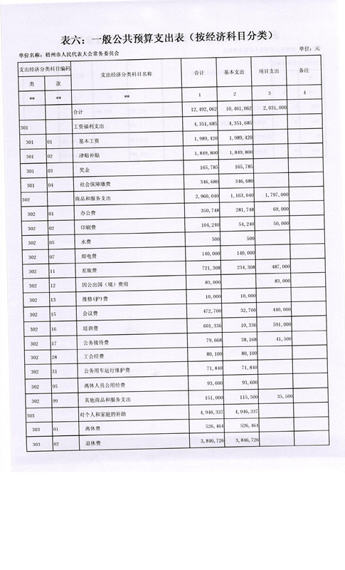 (一)基本支出10,461,062元,占支出总预算82.5%,由于工资调整,人员增加,比去年同期增加1,283,595元,同比增加13.99%。主要是用于保障市人大常委会机关正常运转的基本支出,包括按照国家标准安排的在职人员工资和津补贴,离退休人员的离休费、退休费、医疗保险、住房公积金和按市财政公用定额标准而安排的办公费、印刷费、水电费、培训费、差旅费等日常公用经费支出。
