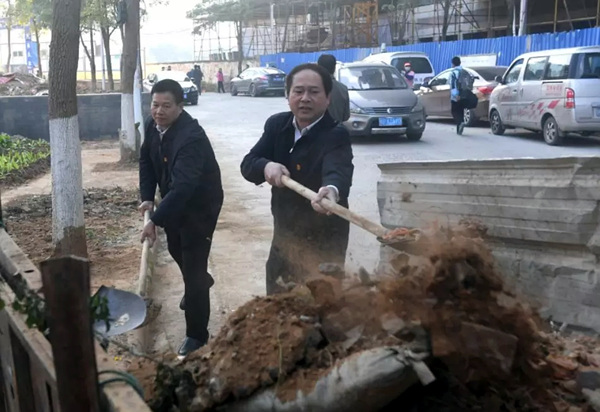 当天早上,市领导全桂寿、蒋海东、黄振饶、黎永益,与市委办、市地震局、梧州日报社及长洲区机关干部60多人来到新闻路责任区,开展环境清理,清扫道路,清除绿化带和道牙石缝里的垃圾、杂草,清除乱张贴的小广告。市委书记全桂寿与其他市领导手握铁锹,清理堆积沿路的垃圾、黄泥,合力将堆积在路边的水泥块、砖块抬上垃圾清运车。