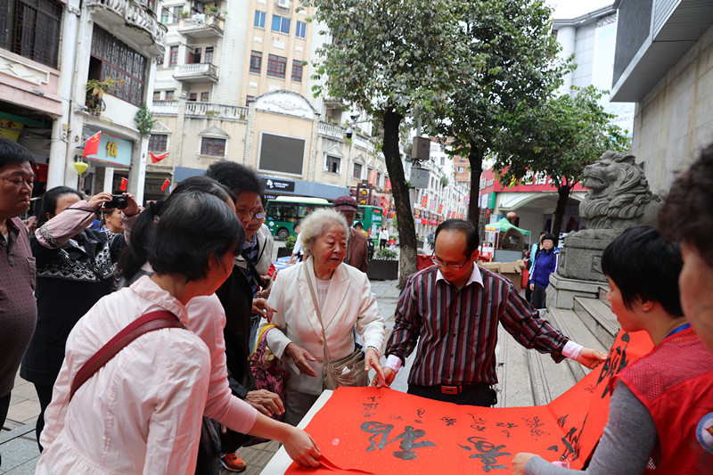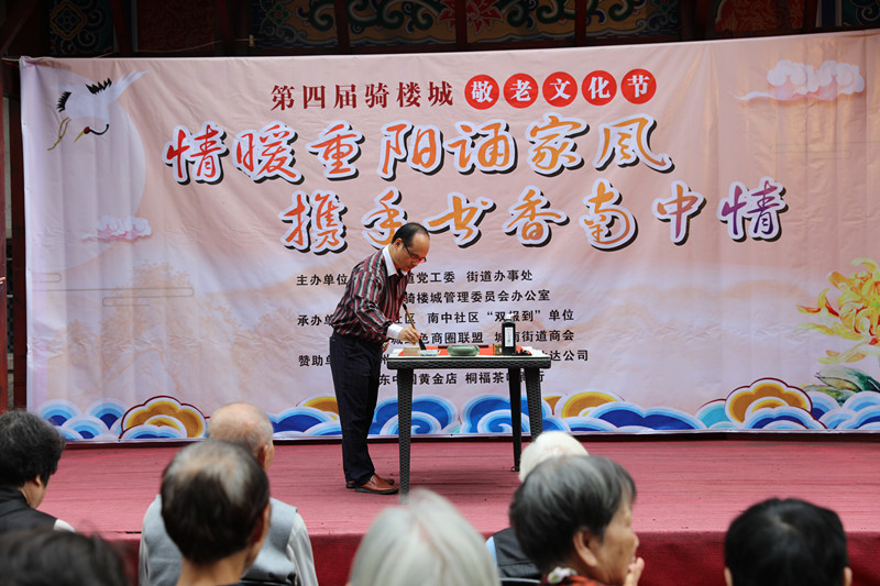 10月17日,正值重阳佳节,秋风送爽。市人大常委会副秘书长、办公室副主任、机关党组成员茹恩南和市人大机关部分党员同志代表市人大机关党组织到南中社区参加万秀区城南街道办南中社区第四届骑楼城敬老文化节暨“情暖重阳诵家风 携手书香南中情”活动。活动中,茹恩南现场挥毫为社区老人表演书法节目,并将7幅“寿文化”字主题的书法作品分别赠予社区80岁以上老人,表达诚挚的祝福。