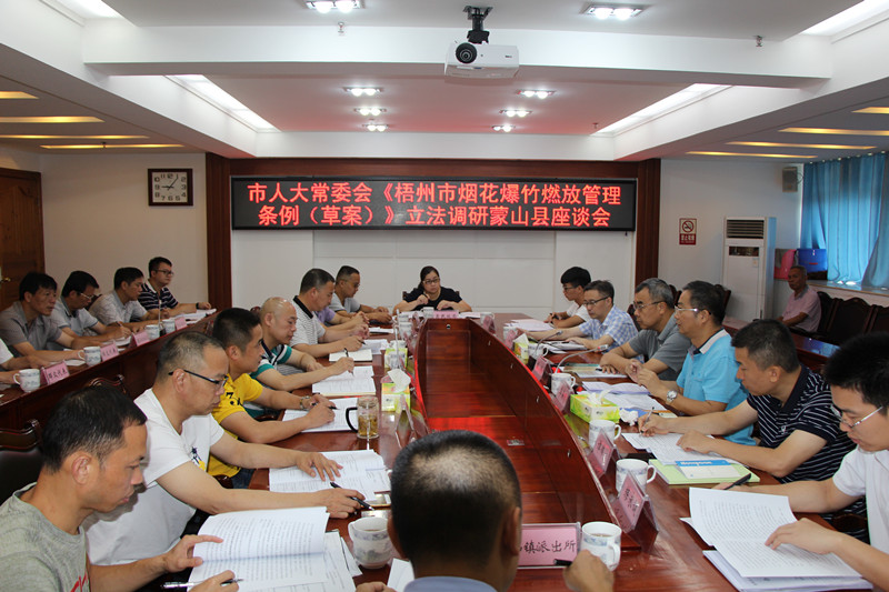 7月12日,市人大常委会副主任程权率立法调研组到蒙山县开展《梧州市烟花爆竹燃放管理条例》(草案)立法调研,并召开座谈会。蒙山县人大常委会副主任覃虹虬,县人民政府副县长、公安局局长甘家科,政府相关部门负责同志,社区代表、群众代表、烟花爆竹从业人员代表及部分人大代表参加座谈会。