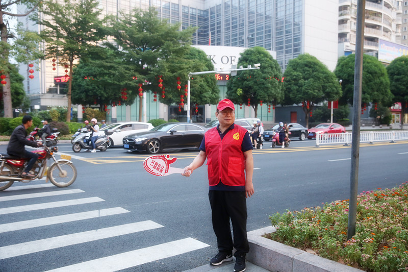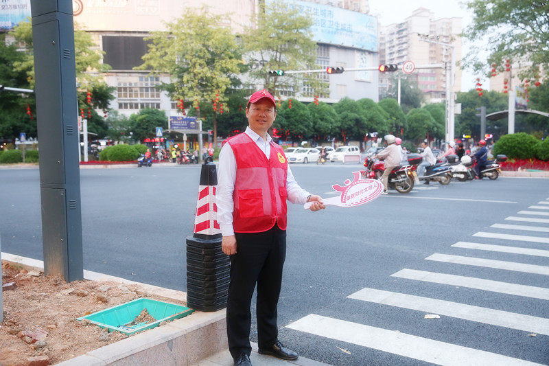 此次志愿服务地点为市政府办公大楼对出红绿灯路口,该路段属于市区主干道,路况复杂,交通流量大。11月3日下午17时30分至18时30分,正值交通晚高峰时段,加上周边区域举行宝石节有关活动,该路段车水马龙。谢凌云、徐远洲与人大常委会机关的党员干部一起,身着红马甲、头戴小红帽、手持劝导旗,分立于各个路口,引导行人有序通行,对横穿马路、不走人行横道、闯红灯的群众进行劝导,以实际行动参与文明交通创建,践行为民服务初心,传递“我为城市建设出份力”的正能量。