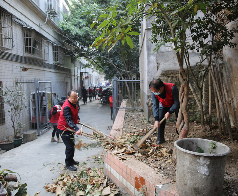 图为谢凌云一行深入居民区的背街小巷,清理卫生死角、清洁公共环境。