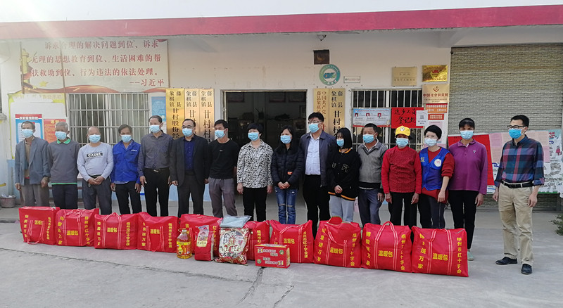 图为李桂珍(左八)到藤县象棋镇甘村给建档立卡户送去慰问品并与他们合影。
