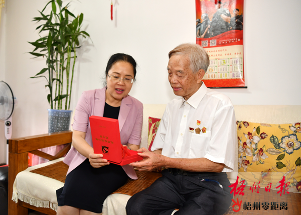 6月29日,市长钟畅姿来到老党员吴锦元家中开展慰问,为其佩戴“光荣在党50年”纪念章。梧州日报记者 李鸿荣 摄