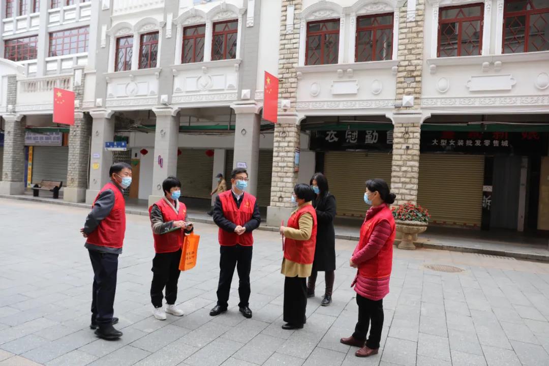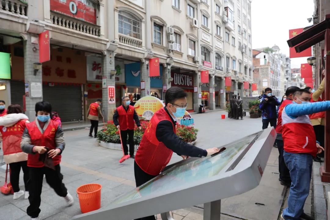 在骑楼城牌坊及周边区域,黄中贤与大家一起劳动,认真细致地擦拭步行街铜像、清扫垃圾、整理杂物。随后,黄中贤走进骑楼城周边商铺,与经营业主交谈了解经营情况,向他们耐心解释疫情防控相关措施和工作要求,嘱咐商户落实好“门前三包”责任制,以干干净净的城市环境迎接四方游客。