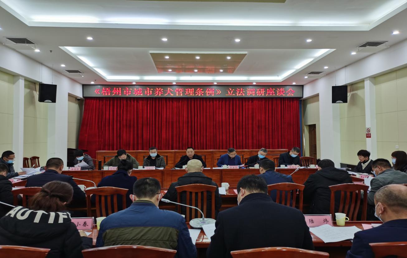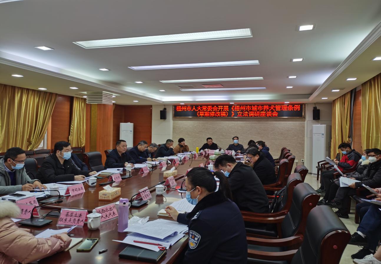 2月14日至18日,市人大常委会组织立法调研组,由副秘书长、办公室副主任牵头,常委会法制委、法工委参与,联合市司法局、市公安局、市农业农村局、市城市管理监督局等部门,深入蒙山、藤县、岑溪、龙圩等4个县(市、区),就《梧州市养犬管理条例(草案修改稿)》(以下简称《条例(修改稿)》)开展立法调研座谈。