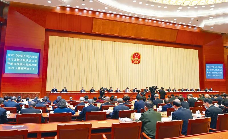 地方各级人民代表大会和地方各级人民政府组织法是关于地方人大、地方政府的组织和工作制度的基本法律。修改这部法律,是新时代坚持党的全面领导、保证党领导人民依法有效治理国家的必然要求,是不断发展全过程人民民主、保证人民当家作主的重大举措。图为2021年12月20日,地方各级人民代表大会和地方各级人民政府组织法修正草案二审稿提请十三届全国人大常委会第三十二次会议审议。《中国人大》杂志社供图 马增科/摄