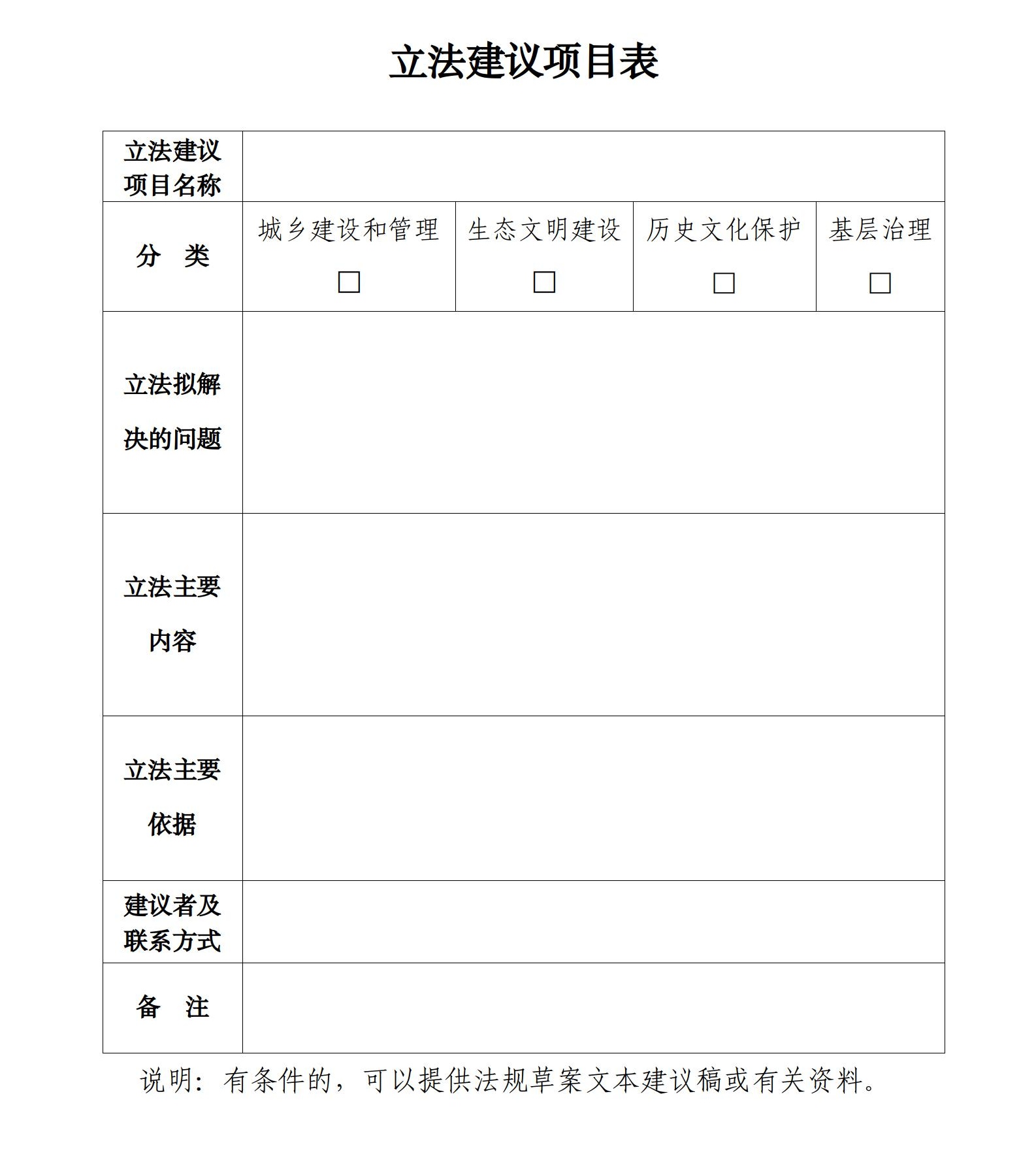 四、立法建议项目应以书面提出,包括项目的名称、拟解决的问题、主要内容、主要依据等,并请注明建议人姓名(单位名称)和联系方式,也可以登录梧州人大网(http://www.gxwzrd.gov.cn/)下载立法建议项目表。